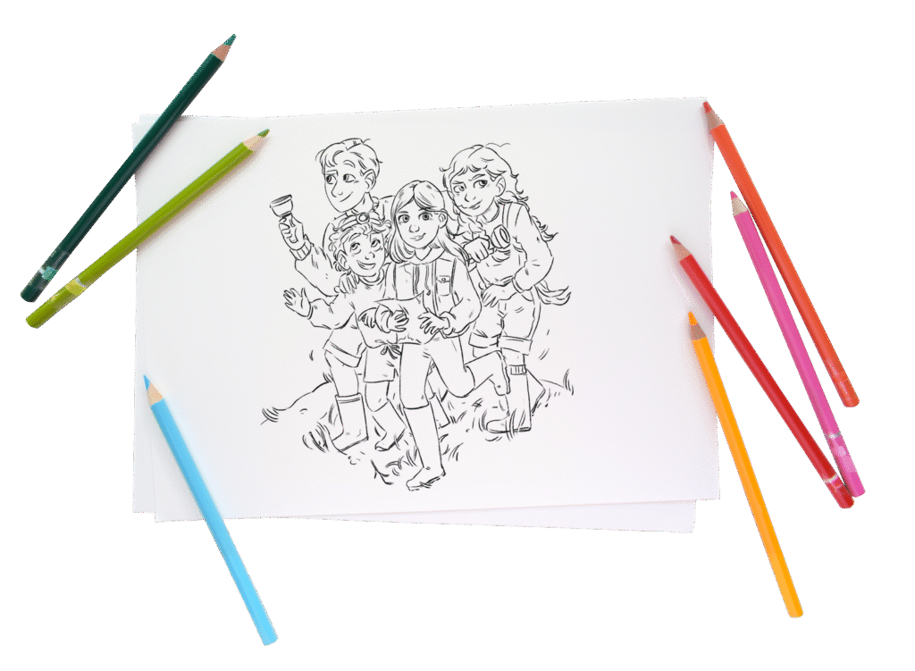 Du kan tegne, farve, gætte, skrive og lege detektiv – præcis som børnene i historien.